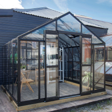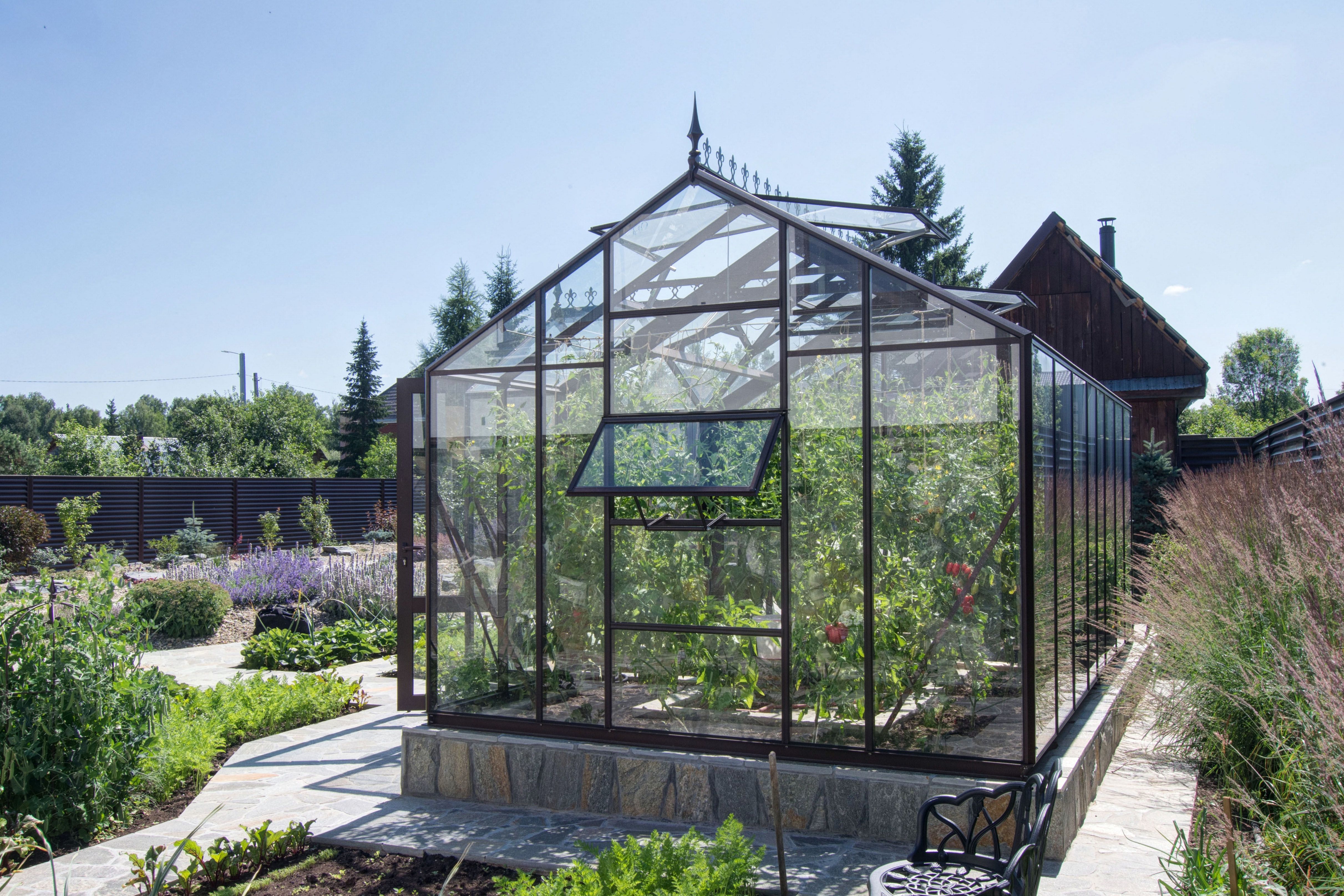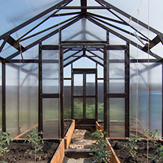 В теплице используется стекло либо закалённое стекло, предназначенное для тепличных конструкций. Закалённое стекло проходит термическую обработку, благодаря чему становится прочнее и безопаснее в эксплуатации. Материал обеспечивает высокую светопроницаемость, не мутнеет со временем и сохраняет эстетичный вид.
